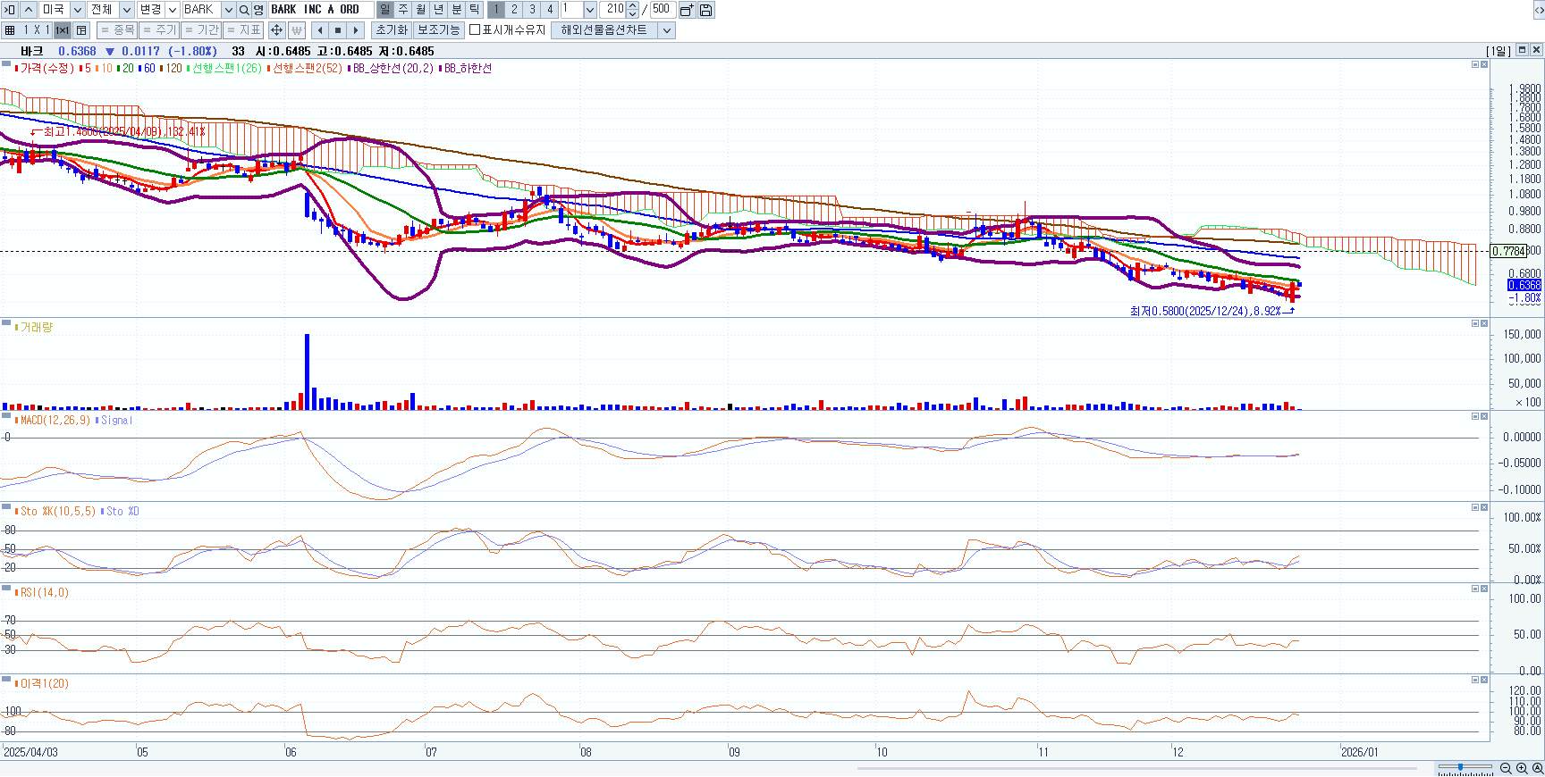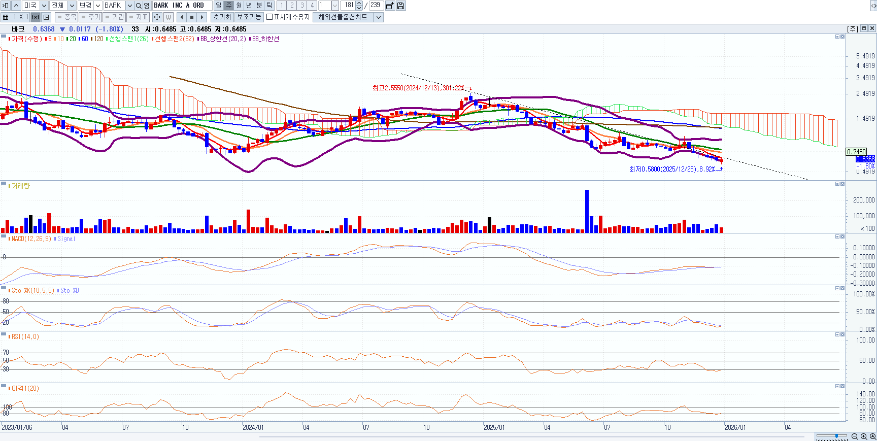 ☞ 바크박스(BARK)는 주가가 추세선(저항선_가로선)을 돌파하지 못하고 있으며, 이동평균선은 역배열, 보조지표 역시 뚜렷한 매수 신호를 보이고 있지 않으므로 당분간 매수 보류