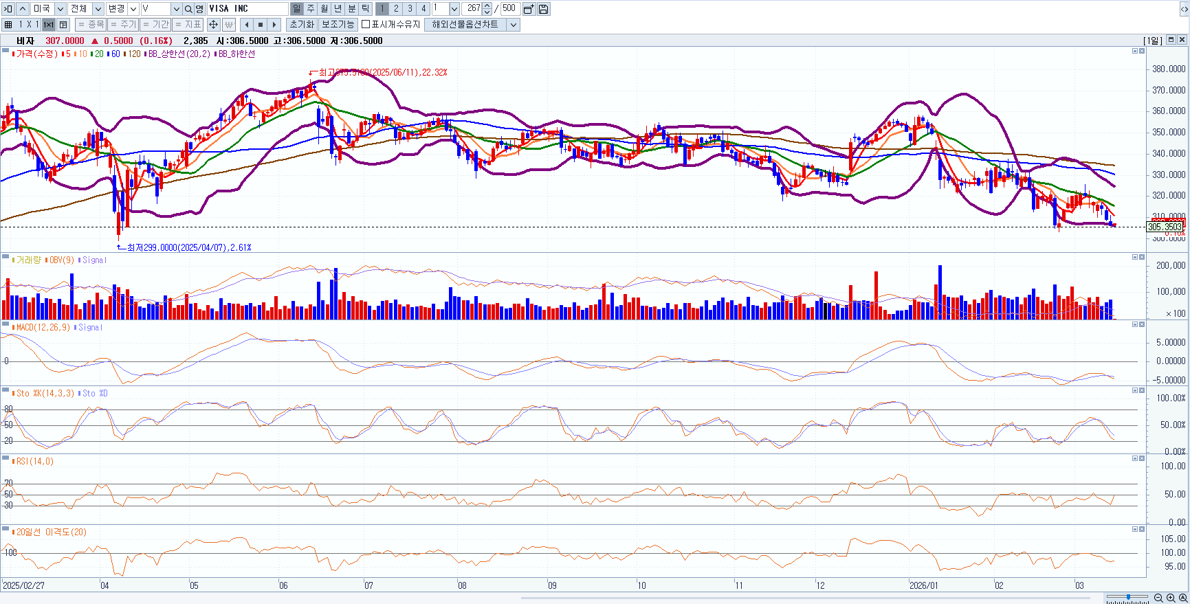 ☞ 비자(V)는 주가가 주봉 차트상 추세선(지지선_직선)을 이탈하여 하락 중이기 때문에 당분간 매수 보류