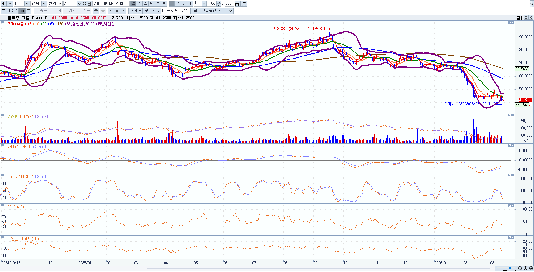 ☞ 질로우 그룹(Z)는 주가가 주봉 차트상 전고점 대비 크게 하락하였으며 추세선(지지선_직선)을 이탈하고 있음. 또한 일봉 차트 상 에서도 상단의 추세선(지지선_가로선)을 이탈하여 하락 중이기 때문에 당분간 매수를 보류하고, 최소한 주가가 일봉 차트 상 상단의 추세선을 돌파하고 보조지표가 매수 신호를 보낼 때 매수 여부를 고려